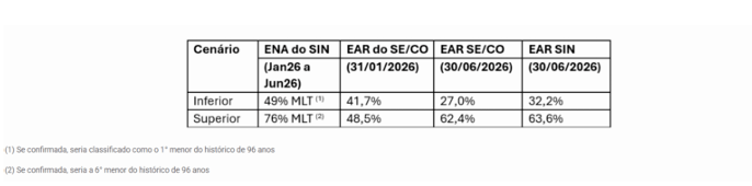 Já a Energia Armazenada no SE/CO aparece com 27% dos níveis na projeção inferior e 62,4% na superior. Assim, a hipótese mais favorável aponta para um volume 4,1 pontos percentuais (p.p.) abaixo do registrado de janeiro a junho de 2025, enquanto a análise desfavorável indica 39,5 p.p. abaixo.